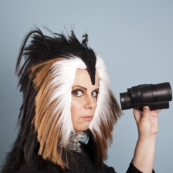 On entering the theater a lady with feathers on her jacket (later we find out she is a grouse) asks if we have any bread in our bags. We sit down and our eyes settle on Rita Grebe, a woman who believes she’s a bird–a Great Crested Grebe. It’s impossible not to find Rita fascinating; she’s grotesque, but weirdly beautiful. Her Grebe feathers draw you in first, as the eye admires her plumage, and soon I?m drawn to the two feathers that spring from Rita’s head, like playful exaggerated eyebrows raised quizzically. We’re soon drawn further in to this alternative world by Caroline Smith’s performance. Her physical movements and facial features are compulsive; I would like to turn away, but can’t, it’s mesmeric; the feeling is further enhanced by Rita’s vocabulary and diction: Germanic, colloquial, idiosyncratic, not always easy to follow, but the sounds that Rita makes attract: Rita invites us to become twitchers, and able to jizz (double meanings abound: in this sense it means identification of bird-like features.). Later in the performance Rita invites the audience (twitchers) to take photos on their mobile phones. Unsettling, but again compulsive. The performance is darkly comic, even when it is not entirely clear why. When Rita feeds (or rather gently stuffs) bread into the grouse, for example, it’s uncomfortable, but there’s disturbed laughter.