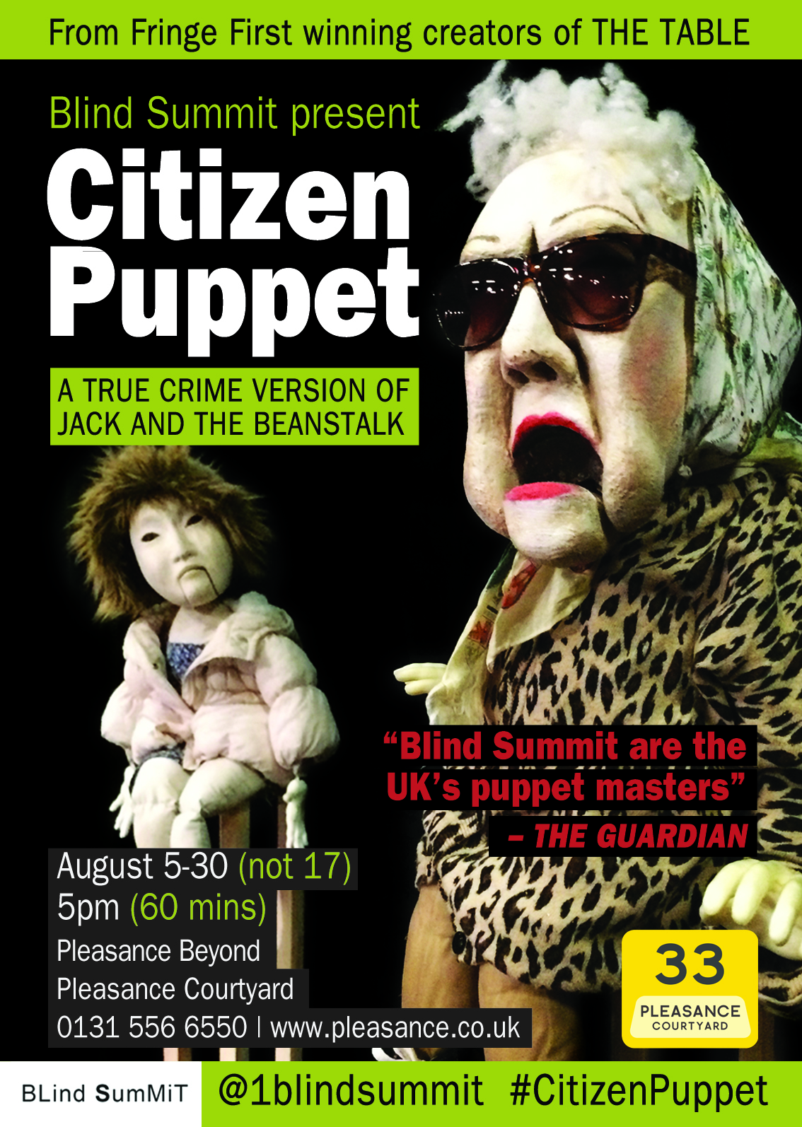 Once upon a time in a far off imaginary place… a giant fell out of the sky. ‘There were roofs down, windows blown in’, says Puppet Granny Tina Henderson, puffing on a Malboro Light. ‘It wasnae funny.’ The makers of Fringe First Award-winning show The Table, return to Edinburgh with a puppet-docudrama which tells the true story of Jack and the Beanstalk. They look behind the scenes and uncover a dark tale of gambling, greed, theft and murde