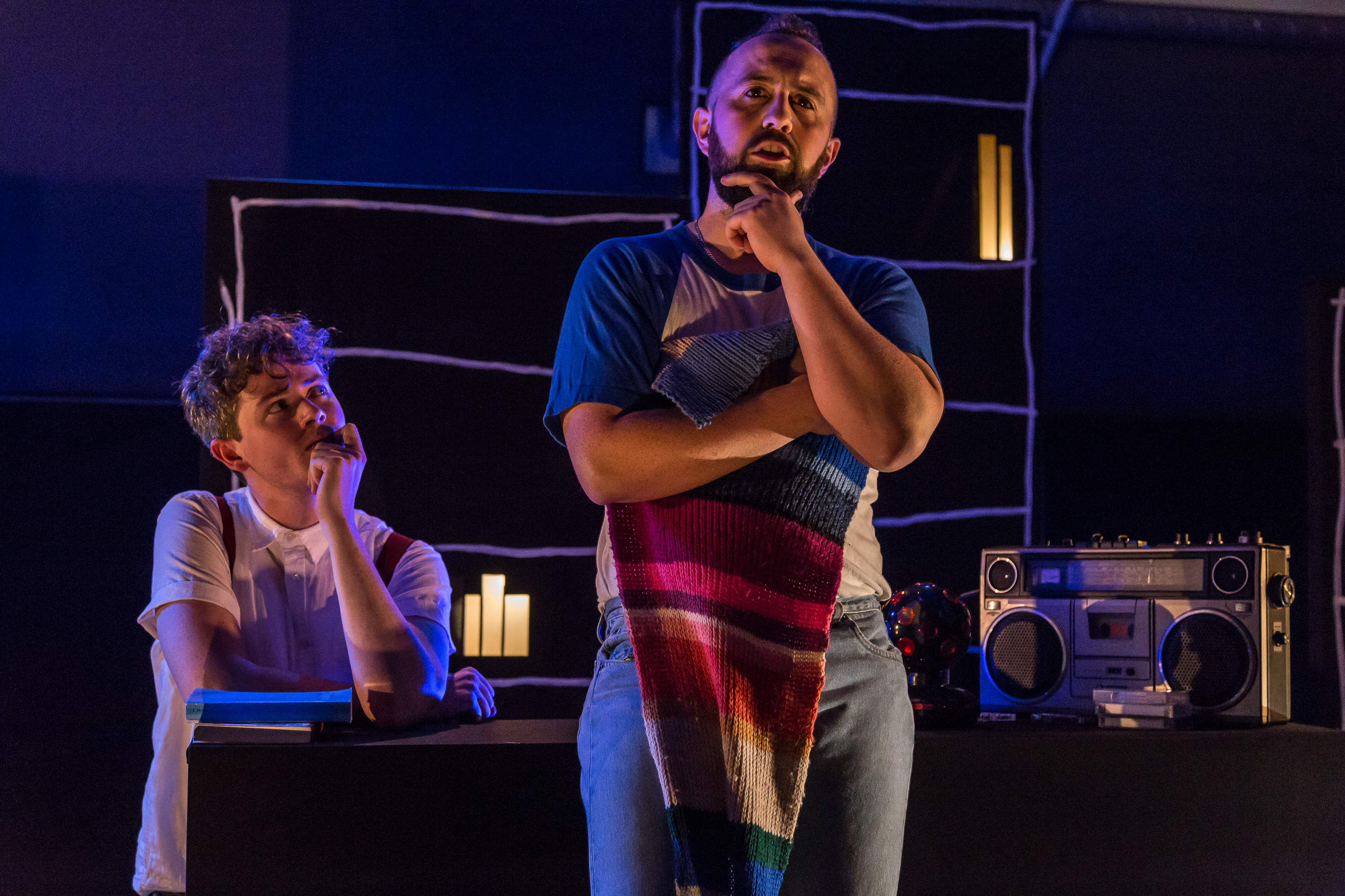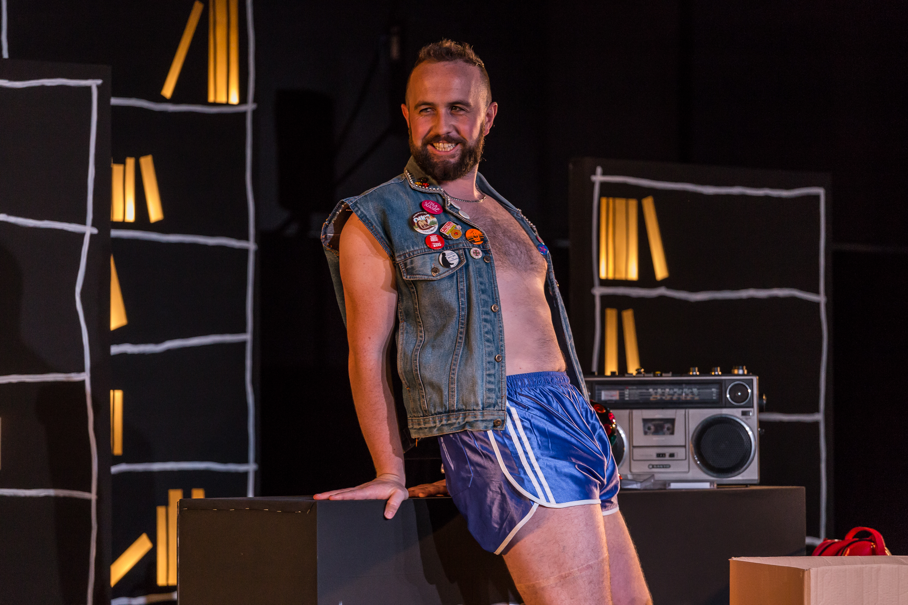 Being played out in the Lyceum Studio, normally used for rehearsals, was the long awaited and anticipated play Love Song To Lavender Menace by James Ley. Set in Edinburgh’s gay community in the mid to late 1980s, with the city’s gay bookshop taking centre stage. As the lights dim and change direction the set design springs to life; a tall structure of towering book cases simplified with white lines creating the outline of books, the effect channels an image of the many barriers we cross in search of the right answers. We may also observe an 80s ghetto blaster complete with tapes and a red duffle bag that has nostalgia written all over it. A simple but effective stage design makes way for the smooth operators that are proud owners of the one and only gay bookshop in Edinburgh’s New Town. Skipping onto the stage with a repetitive tongue and engulfed in a happy smile that would make you think that you were strutting your stuff on the dance floor of Fire Island , you could sense this was going to be a show full of fun and humour, as well as delicate politics. Striking first, Lavender Menace makes a point straight from the start that this is a piece of theater that is to be enjoyed, laughed at and not to be taking too seriously, opening the door and allowing some of those dark shadows behind it to come out into the light. Liberating !!!!!