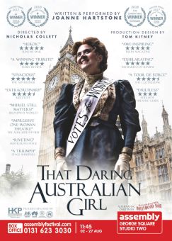 Joanne Hartstone has brought two solo plays to this year’s Fringe, & I have had the gladdening delight of seeing them both. On this second occasion, just as with ‘The Girl Who Jumpd Off The Hollywood Sign,’ Hartstone has penetrated the obscurer mists of history with a thespian eyeglass & found us a figure from her native land. Breathing life into visionary clay, her subject is Muriel Matters, a romantic young actress from ‘claustrophobic’ Adelaide who was swept along by, & then became a major figurehead for, the Suffragette movement of the United Kingdom.