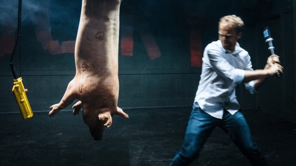 As Rocky continues to be superimposed onto the modern political battlefield – still punching – its all quite fascinating stuff, all the while being dramatically interspersed with exceptionally good pieces of quite-scary-actually physical theatre. Realistic one-man fights & midmorph lycanthropic rages offer deamonical interludes & counterpoints to Burian’s light-emitting soliloquies. Beside all this, of course, the menacing & visceral presence of a mutilated pig hangs on a hook, Hellraiser style. A gripping production all round.