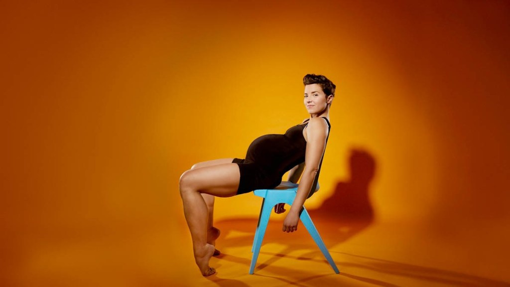 It began with a greatly realistic scene of a woman (Tamsin) peeing on a pregnancy test. She wore a long white coat and with the completely white back ground the stage (or studio) was set. First there was a little narrative then speedily on to the affluent dialogue of realised comedy, with that realness and with a kind of fast ska she released herself with great pros and cons about pregnancy.