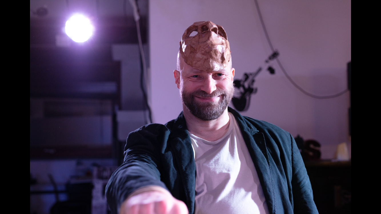 The music plays a crucial part in this piece. The sound and the physical play are close and intimate partners, and both need to be in full sync to make the world of Steve come alive. We are blessed to have the wonderful percussionist Max Charue from Charlesoi with us. Since there is no stage set, Max provides the full soundscape of all the actions that I do in mask. If I open a door, throw an egg into a pan or blow up a safe in a bank, he makes you hear and therefore see it. It’s magic.