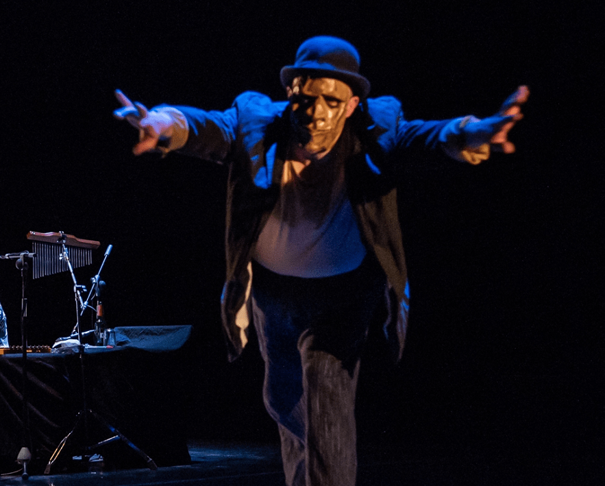 features four full masks created and played by a single actor, without objects, without set, making the soundscape primordial. The multi-instrumentalist on-stage synches the high whistle of darting off a cliff, the moment of frozen silence, the whoosh of falling, the bam splat of landing….all these things that speak volumes in pictorial language. This piece is a lone man’s struggle to survive the repercussions of a pandemic. With Ralf Wetzel, music: Max Charue.