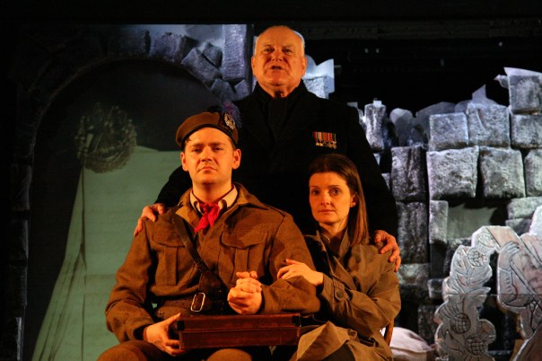 This week’s wickedly lovely play, the Beaches of St.Valery, came from the pen of the excellent Stuart Hepburn. The show was making a welcome return to Oran Mor, with the original cast (James Rottger, Ron Donachie and Ashley Smith) reprising their roles. We were introduced to young Callum (Rottger) all dressed up in his smart army uniform, and soon caught up in the horrors of WW2. We watched as he and other Scottish soldiers of the 51 st Highland Division dealt with the reality of wartime.