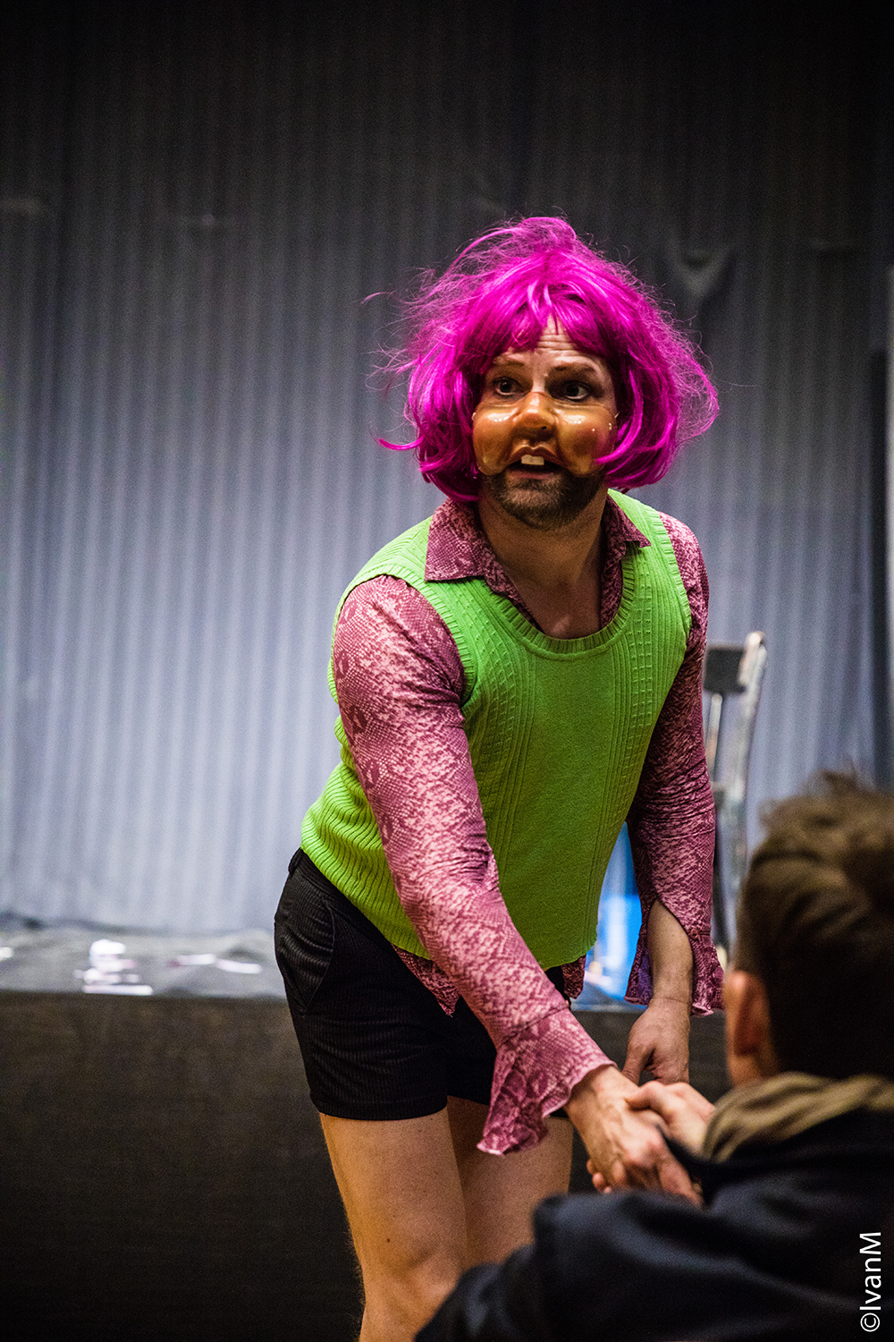 My training? Throughout the last 5 years, I went through a heck of different trainings in Clown & Mask work, improvisation theatre and acting. My main teachers have been Keith Johnstone (CA), Lee Delong (F), Shawn Kinley (CA), John Turner (CA), Inbal Lori (IR) and Kelly Agathos (GR) & Ben Hartwig (D). Aside of that I am a trained electrician and I have a PhD in Organization Theory.