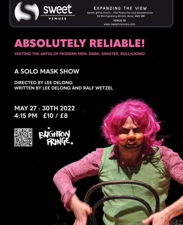 Last year, the wonderful Ralf Wetzel performed our Absolutely Reliable!, which is a collaboration born of one of my workshops. It started with just a little mask I had bought in a joke and magic shop in Paris, but when Ralf put it on, he became George from head to toe. It was remarkable. The mask is now much more elaborate, and the show has lived on many stages, and we were thrilled to be part of Brighton Fringe last year. I adore this city! I spent many Christmas holidays here and cherish the memories of walks on the beach and the pier. I once played here, Worstward Ho! by Samuel Beckett with the Gare St. Lazare Players. I love the energy of this place, and the Brighton Fringe is my favorite of all the many Festivals I’ve attended. It’s large yet remains friendly. And it’s in a gorgeous setting. It’s got it all.